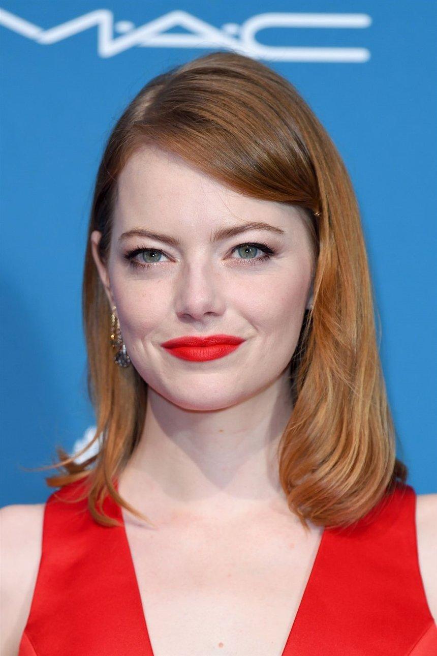 Рыжеволосая красавица, Эмма Стоун, демонстрирует симпатичную укладку с длинной челкой, заколотой на одну сторону. Моложавый эффект будет создан, если вы чуть приподнимите челку надо лбом и не будете ее приглаживать. Локоны можно завести за ухо и закрепить невидимкой, чтобы они не разлетались.