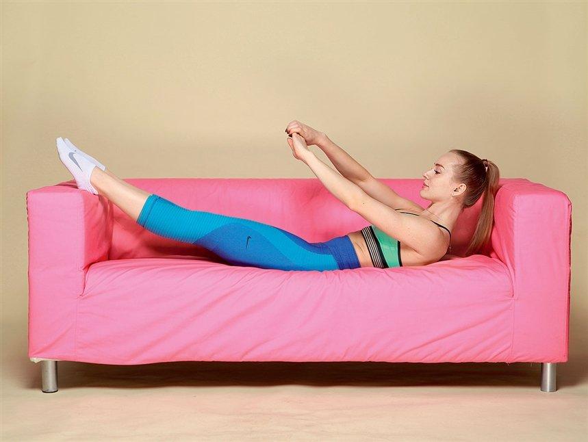 Divanning chetiga o'tiring. Oyoqlaringizni erga tegmasligi uchun ko'taring. Endi siz juda noqulay vaziyatdasiz, muvozanatni saqlashingiz kerak, demak qorin mushaklari taranglashgan. Shu bilan birga, orqa tomon ham taranglashadi, shuning uchun o'zingizni qo'llaringiz bilan yordam bering, ularni divanga qo'ying.